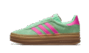 An iconic silhouette in the history of Adidas, the Gazelle has been revisited by the German brand's creative teams. This Adidas Gazelle Bold Pulse Mint Pink features a mint green suede upper, accompanied by three bright pink leather stripes matching the heel tab and branding on the tongue. Its originality lies in the thick sole that elevates it. The traditional gumsole is available in three superimposed layers. The gold "Gazelle" branding on the side panel adds the finishing touch to the design. The Gazelle, still her, still her... SKU: H06125 Release date: June 2022 Colorway: PULSE MINT/SCREAMING PINK/GUM