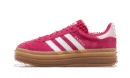 The German brand's outfitters unveil a revisited take on the Gazelle, the iconic silhouette in the Adidas catalog. This Adidas Gazelle Bold Wild Pink features a pink suede upper, accompanied by the three emblematic white leather stripes. Its originality lies in its thick sole, which creates a raised effect with a gumsole in three superimposed tiers. The finishing touch is the white "Gazelle" branding on the side panel. SKU: ID6997 Release date: TBD Colorway: WILPNK/FTWWHT/CLPINK