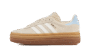 The Adidas Gazelle Bold Wonder White Clear Sky features a cream suede upper, accompanied by three white leather stripes. The heel tab adds a touch of color with sky-blue leather. Its originality lies in its thick sole, which elevates the pair thanks to three superimposed layers, and the gold "Gazelle" branding on the side panel adds the final touch to the design. SKU: JH5540 Release date: April 2024